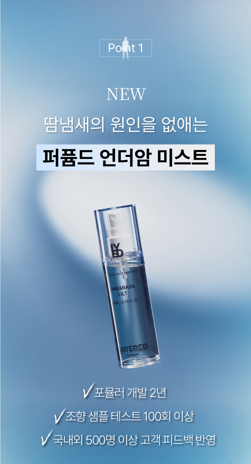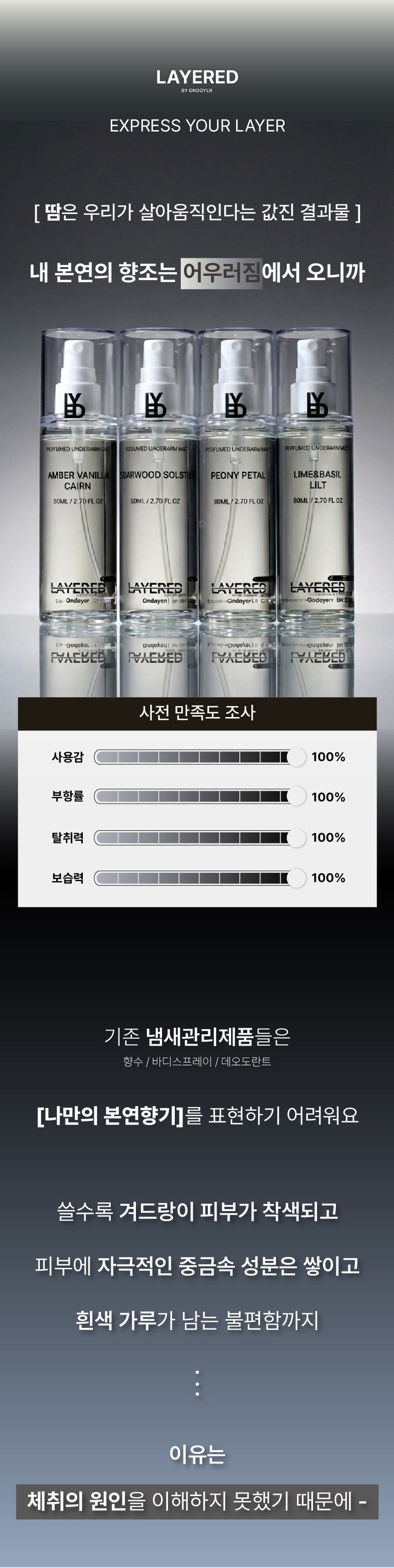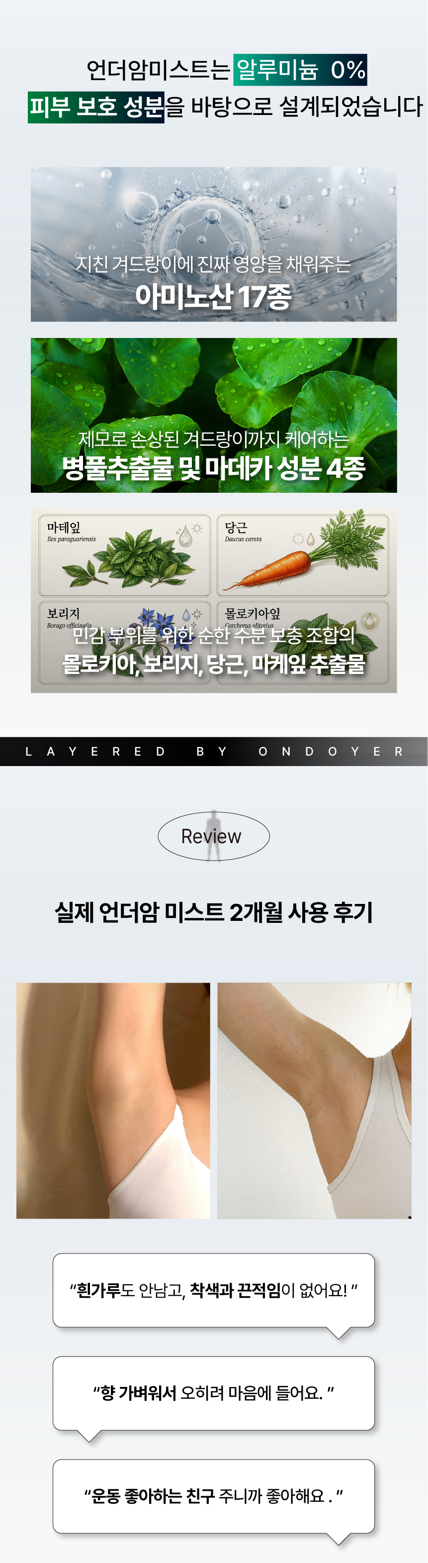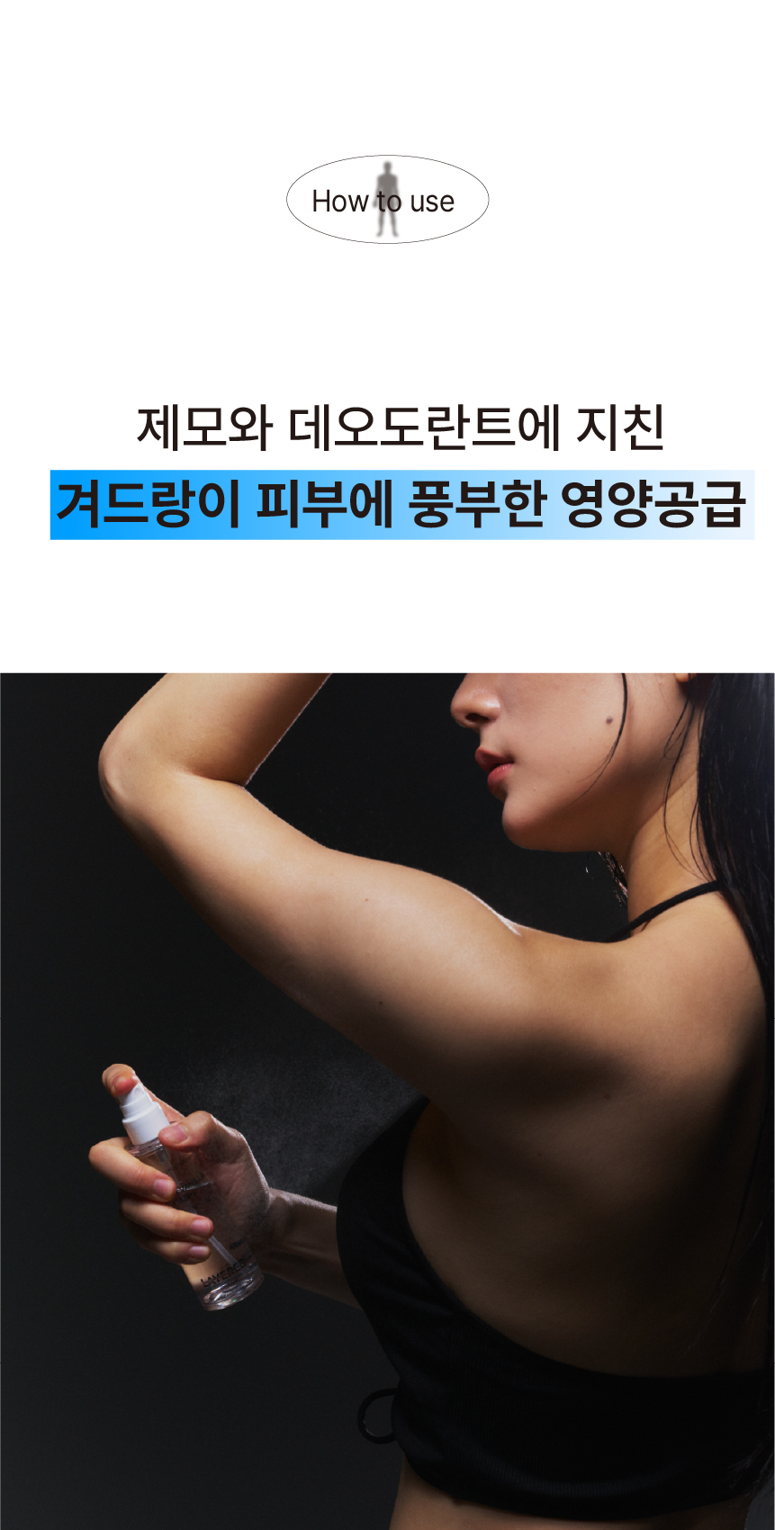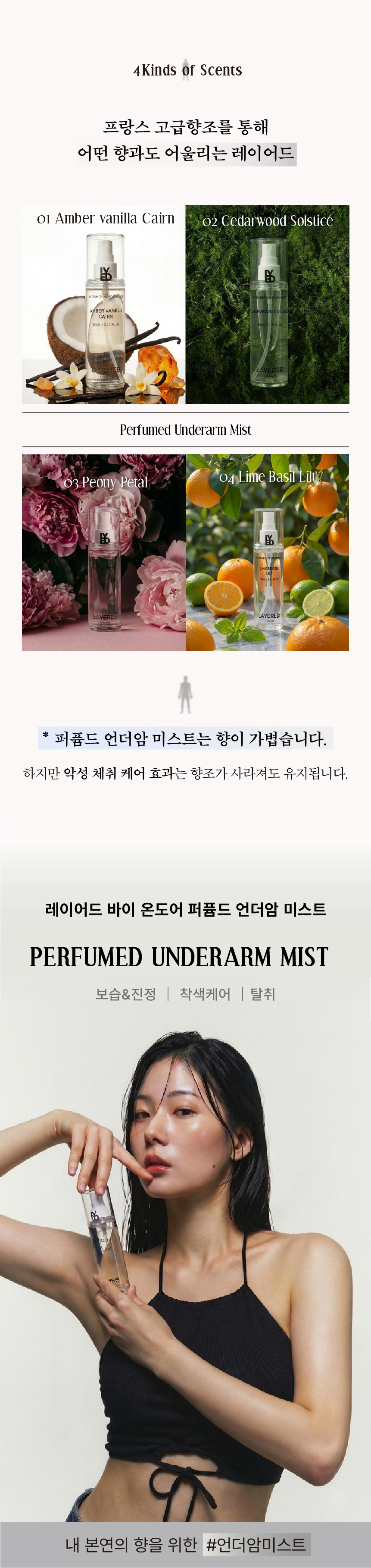 제모 그리고 기존 데오도란트의 자극으로 민감해진 현대인의 겨드랑이 피부 각질층에 풍부한 영양공급, 그리고 부정적 체취를 예방 및 관리하기 위해서 고안되었습니다.